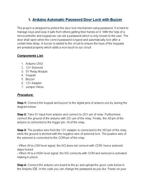 Alright, let’s get down to business and talk about the gear you’ll need for this awesome Arduino password door lock system . Don’t worry, most of these are pretty standard and readily available at most electronics stores or online. First off, you absolutely need an Arduino board . The Arduino Uno is a fantastic choice for beginners – it’s widely supported, easy to use, and has plenty of pins for this project. Next up, you’ll need a keypad . A 4x4 matrix keypad is super common and perfect for entering numerical passwords. These usually come with a few jumper wires, which is super handy. For the actual locking mechanism, a 12V Solenoid Lock or a Servo Motor are your main options. Solenoid locks provide a strong, physical bolt, while servo motors can be used to turn a deadbolt or a latch. We’ll also need a Power Supply – a 12V DC adapter is usually required for the solenoid lock, and make sure your Arduino has its own power source too (USB or a separate adapter). To control the solenoid, you’ll likely need a Transistor (like a TIP120) and a Diode (like a 1N4007) to protect your Arduino from voltage spikes. Don’t forget Jumper Wires – you’ll need a bunch of these to connect everything together. An LCD Display (like a 16x2 character LCD) is highly recommended for providing feedback to the user – it can show prompts like “Enter Password” or “Access Granted/Denied”. You might also need a Breadboard for prototyping and making connections easier before you finalize everything on a perfboard. Lastly, a Resistor (around 1k ohm) might be needed for the LCD’s contrast. Having a computer with the Arduino IDE installed is also crucial for uploading the code. So, gather these bits and bobs, and you’re well on your way to building your very own secure system!