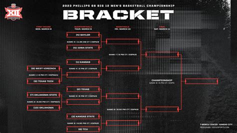 Alright, the moment we’ve all been waiting for – predicting the championship game of the Big 12 Tournament bracket ! This is where legends are made, and the winner earns an automatic bid to the NCAA Tournament. Predicting the champion is no easy task, as it requires a deep understanding of each team’s strengths, weaknesses, and their ability to perform under pressure. Consider the potential matchups between the top contenders, and think about which team has the best chance of executing their game plan and coming out on top. Also, think about the potential for upsets and surprises. The Big 12 is a tough conference, and any team can get hot and make a run to the championship game. Don’t be afraid to pick a dark horse to win it all, as long as you have a good reason to believe in them. When making your championship prediction, it’s important to consider more than just talent and skill. You also need to think about mental toughness, leadership, and the ability to handle pressure. The team that can bring these qualities to the court will have the best chance of hoisting the trophy at the end. So, who will it be? Will it be one of the top contenders, or will a surprise team emerge to claim the title? Only time will tell, but one thing is for sure – the Big 12 Tournament championship game is sure to be a thrilling and unforgettable event. Get ready for some great basketball, exciting finishes, and the crowning of a champion!