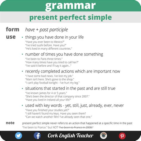 The simple perfect tense is used to show that an action has been completed at some point in the past before now. The focus is on the result of the action, rather than the action itself. The formula for the simple perfect tense is: have/has + past participle . For example, “I have eaten,” “She has gone,” and “They have finished.” This tense is incredibly useful for expressing completed actions that have relevance to the present. For instance, saying “I have visited Paris” tells someone about your experience, implying you have memories or knowledge related to Paris.