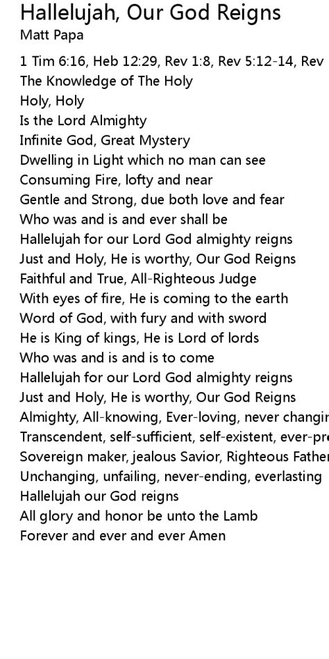 Ultimately, Hallelujah for the Lord God Almighty Reigns is an invitation. It’s an invitation to find your own Hallelujah moment. It’s about connecting with the lyrics on a personal level and letting the message transform you. Maybe it’s in the quiet of your morning devotion, the vibrant energy of a church service, or even during a moment of personal struggle where you need to remind yourself of God’s power. The beauty of these lyrics is that they offer something for everyone, every feeling, every situation. Don’t just sing the words; feel them. Let them wash over you and inspire a genuine outpouring of praise from your heart. It’s in that personal connection, that moment of surrendered worship, that the true power of the song is unleashed. It becomes your declaration, your testimony, your Hallelujah. This personal engagement is what elevates the experience from simply listening to music to actively participating in worship. It encourages a deeper relationship with the divine, fostering a sense of awe and gratitude that can permeate all aspects of life. The act of internalizing the lyrics and allowing them to shape one’s thoughts and emotions is a powerful spiritual discipline. It’s about finding those lines that speak directly to your soul, the phrases that encapsulate your deepest hopes or articulate your most profound beliefs. When you find that connection, the song transforms from a collective anthem into a deeply personal prayer or a heartfelt confession. This individual resonance is key to the enduring appeal of such worship songs. They provide a framework for expressing complex emotions and spiritual truths in a way that is both accessible and profound. So, take the time to really listen, to meditate on the words, and to allow the Spirit to move within you. Discover the verses that stir your soul and make them your own. In doing so, you’ll find not just a song, but a pathway to a more intimate and vibrant faith. The repetition of