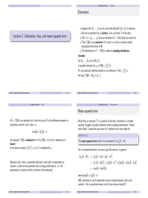 The iestimator bias formula itself is actually quite elegant once you break it down. At its core, the bias of an estimator \(\hat{\theta}\) for a true parameter \(\theta\) is defined as: Bias( \(\hat{\theta}\) ) = E( \(\hat{\theta}\) ) - \(\theta\) . Let’s dissect this, guys. E( \(\hat{\theta}\) ) represents the expected value of our estimator \(\hat{\theta}\) . This is the average value we’d expect our estimator to produce if we could repeat our sampling and estimation process many, many times. The ‘ \( - \theta\) ’ part is simply the true value of the parameter we are trying to estimate. So, the formula is literally saying: ‘The bias is the difference between what our estimator averages to and what the true value actually is.’ If E( \(\hat{\theta}\) ) is greater than \(\theta\) , our estimator has a positive bias, meaning it tends to overestimate the true value. If E( \(\hat{\theta}\) ) is less than \(\theta\) , it has a negative bias, tending to underestimate. If E( \(\hat{\theta}\) ) equals \(\theta\) , then the estimator is unbiased, and its bias is zero. This formula is foundational because it directly quantuates the systematic error. It doesn’t tell us about the variability of the estimator (that’s captured by variance), but it focuses solely on the directional error. Understanding this distinction is key when evaluating estimators. We often want estimators that are both unbiased (low bias) and have low variance, leading to estimators with low Mean Squared Error (MSE), where MSE = Bias( \(\hat{\theta}\) ) \(^2\) + Variance( \(\hat{\theta}\) ). So, while the formula looks simple, its implications are profound for assessing the reliability and accuracy of our statistical estimations. It’s our mathematical compass pointing us toward the true north of our data.