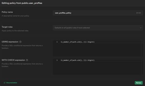 • Policy Expression: auth.uid() = owner OR auth.jwt().role = 'admin'